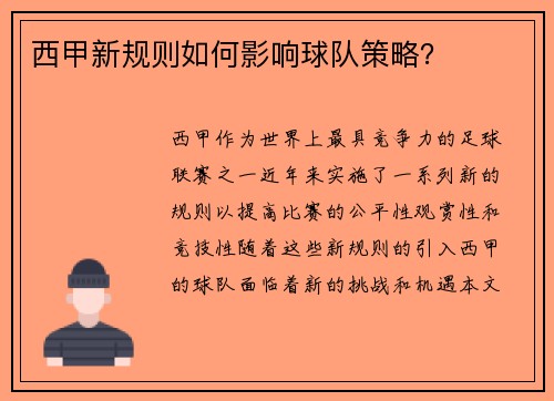 阿森纳逆转胜利的故事,不仅仅是一次单纯的比赛胜利,它背后充满了团队精神、战术调整、球员的个人表现以及主教练的临场智慧。这场逆转胜利再次证明了阿森纳不屈不挠的精神和足球的魅力。本文将从阿森纳在逆转过程中的关键因素进行深入分析,探讨四个方面:战术调整的变化、球员个人的亮眼表现、对手的失误与阿森纳的抓住机会、以及主教练的临场指挥。通过这些方面的分析,我们可以更加清晰地了解阿森纳逆转胜利的真正内涵。 1、...